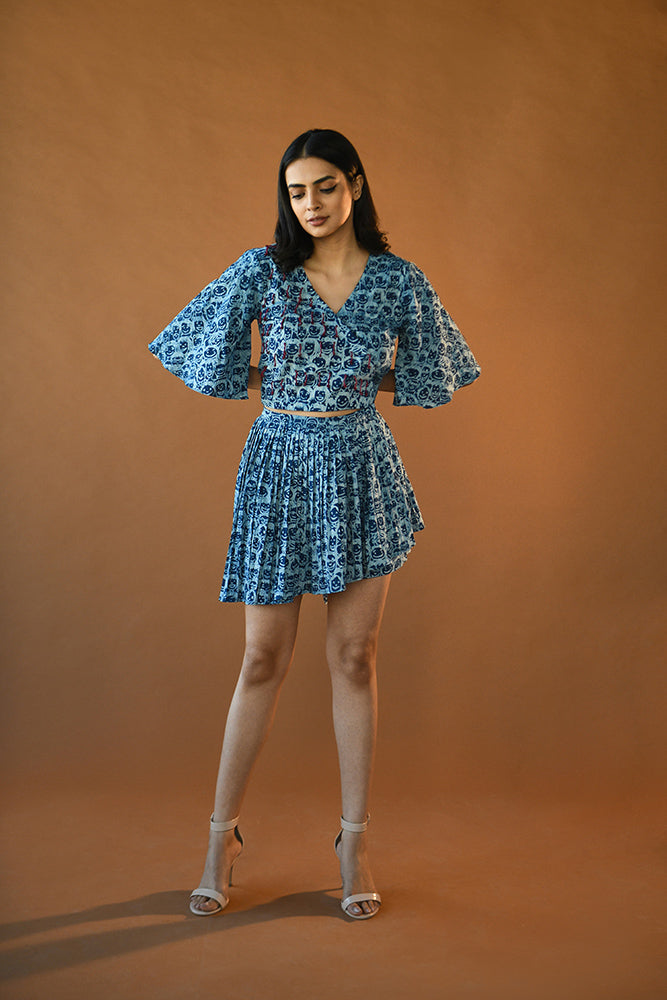 Block Printed in our Custom Faces Print. Wrap-around crop top paired with Pleated Skorts