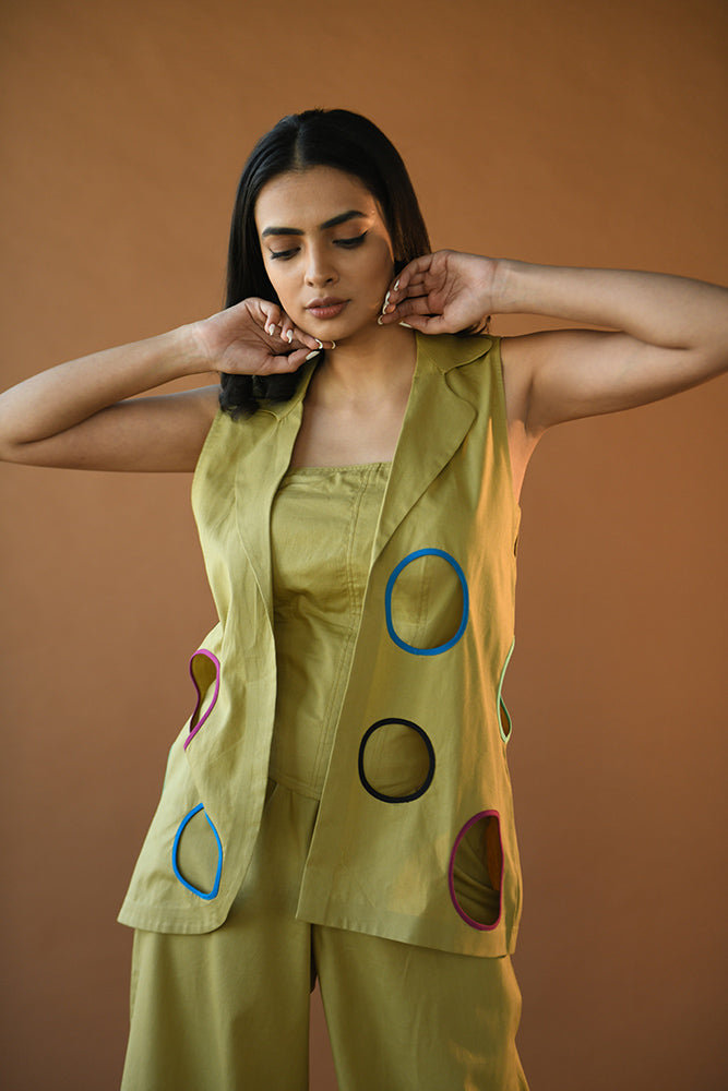 Fitted Bustier with straight cut Pants and Circle Cut-out Jacket Set